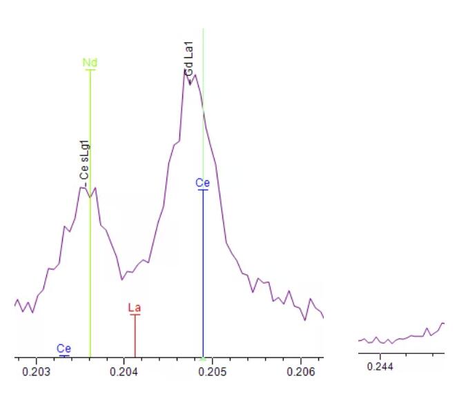 由于稀土線系繁雜,不同元素之間的特征能量(特征波長)非常鄰近,元素之間相互干擾非常嚴重的。下圖可以看到, Gd Lα和Ce Lγ,以及Pr Lα和 La Lβ幾乎完全重疊,故而無法使用常規的方法和默認的參數進行測試。