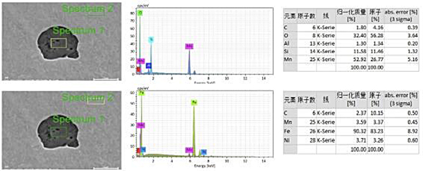 將電子束固定在試樣感興趣的點上,進行定性或定量分析。可對材料晶界、夾雜、析出相、沉淀物、及材料的組成等分析。特征 X 射線譜線強度與相關(guān)元素含量和化學成分有關(guān);此外,相互作用時會產(chǎn)生一定的深度和側(cè)向擴展(μm數(shù)量級),因此EDS接受的X射線來自電子束轟擊點下幾個μm量級的范圍,超過了選定的區(qū)域,因而所獲得的結(jié)果是該體積內(nèi)的某種平均值。