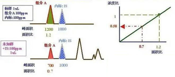 以內標法為例,選一與欲測組分相近但能完全分離的組分做內標物(當然是樣品中沒有的組分),然后配制欲測組分和內標物的混合標準溶液,進樣得相對校正因子。再將內標物加入欲測組分的樣品中,進樣后測得欲測組分和內標物的定量參數,用內標法公式計算即可。