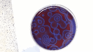 原理:這是一個發(fā)生在平皿薄層上的B-Z反應(yīng)(Belousov-Zhabotinsky反應(yīng))的例子。B-Z反應(yīng)是一種化學(xué)震蕩反應(yīng),它早在20世紀50年代被發(fā)現(xiàn)。反應(yīng)體系會在兩種狀態(tài)之間不斷進行周期性變化,平皿上的“波紋”也會不斷變換。B-Z反應(yīng)有多種版本,上圖中是它的一個常見版本,溴酸鹽與丙二酸發(fā)生氧化還原反應(yīng),以鈰鹽及鄰二氮菲亞鐵離子(ferroin,在還原態(tài)為紅色,氧化態(tài)為藍色)作為催化劑和反應(yīng)指示劑。