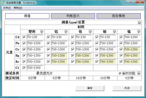 根據材質和元素設定閾值。根據閾值的輸入方法來變更篩選分析的判定方式。閾值設定可依據根據材質的不同所顯示的閾值下限。