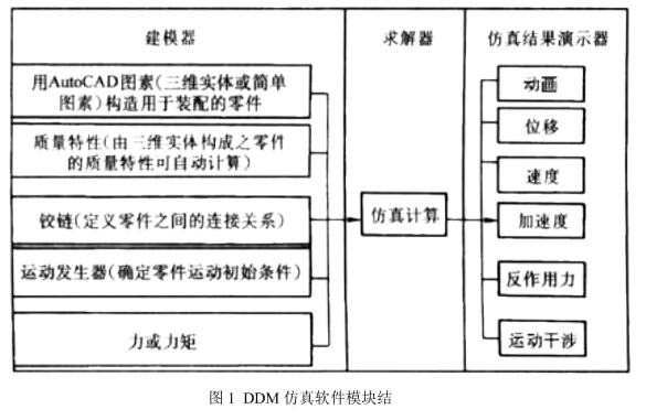 公司推出的、作業(yè)于AutoCAD和MDT平臺上的微機全功用三維組織動態(tài)仿真軟件,包含悉數(shù)運動學和動力學剖析的功能,主要由建模器、求解器和仿真成果演示器三大模塊組成(見圖