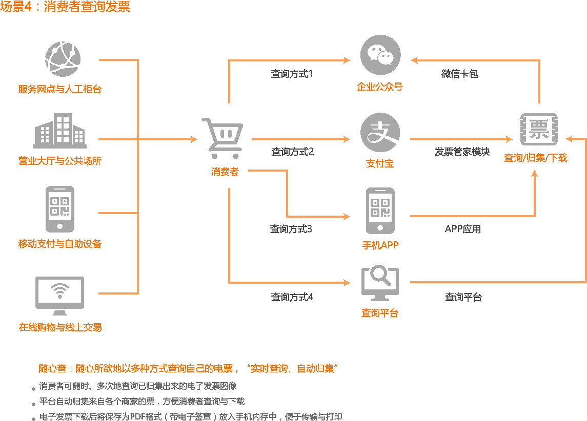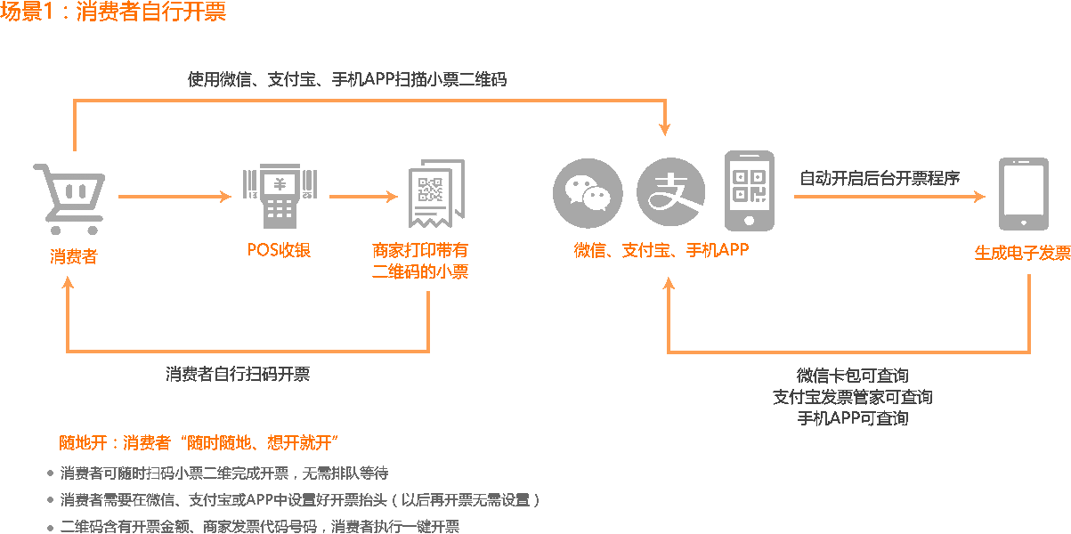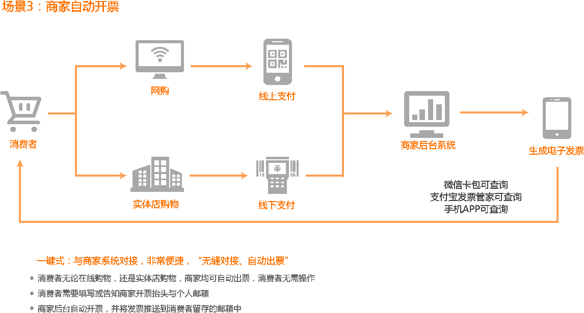 無縫自動開具電子發票服務,節約企業人力、時間成本,提高工作效率減少差錯。消費即開即獲取電子發票,不用等待,易保存,不易丟失,提升消費者體驗。