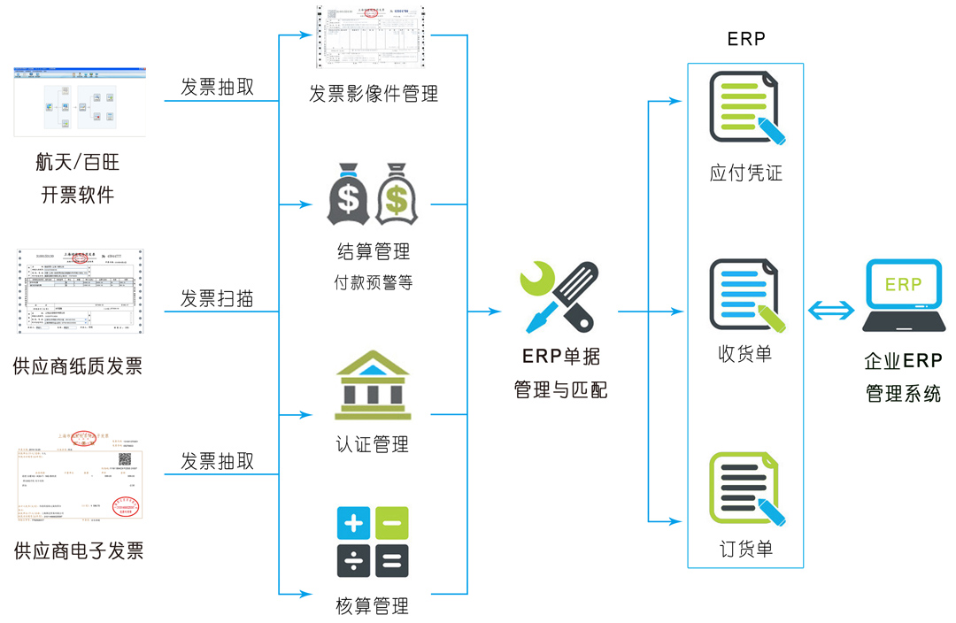 稅航增值稅進(jìn)項(xiàng)發(fā)票管理解決方案,利用從業(yè)務(wù)系統(tǒng)的供應(yīng)商信息中抽取的數(shù)據(jù)和掃描發(fā)票獲得的數(shù)據(jù),通過稅航進(jìn)項(xiàng)發(fā)票管理平臺(tái)及稅控?cái)?shù)據(jù)接口,實(shí)現(xiàn)自動(dòng)識(shí)別認(rèn)證、生成增值稅進(jìn)項(xiàng)明細(xì)表,徹底消除進(jìn)項(xiàng)發(fā)票流程中的重復(fù)勞動(dòng),保證進(jìn)項(xiàng)數(shù)據(jù)的正確性和一致性,統(tǒng)一管理增值稅數(shù)據(jù)和業(yè)務(wù)數(shù)據(jù),實(shí)現(xiàn)靈活對(duì)比查詢,輕松轉(zhuǎn)換成企業(yè)ERP采購訂單或者應(yīng)付憑證。更多進(jìn)項(xiàng)報(bào)表可通過發(fā)票管理平臺(tái)統(tǒng)一生成,客觀、真實(shí)、及時(shí) 。實(shí)現(xiàn)原理圖如下: